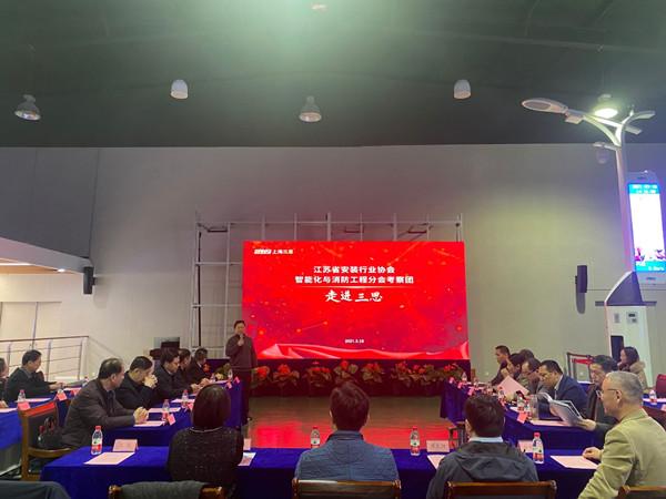2021年3月18-19日,江蘇省安裝行業(yè)協(xié)會(huì)智能化與消防工程分會(huì)組織部分企業(yè)到上海三思電子工程有限公司考察。考察團(tuán)一行在上海三思電子工程有限公司副董事長(zhǎng)陳鳴、董事王彪、副總經(jīng)理張佰明等陪同下考察了三思上??偛亢驮诩紊频墓S。